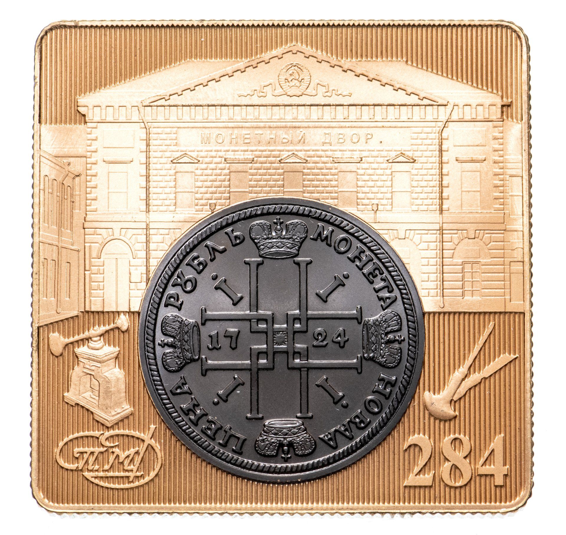 Описание: Реверс: Будівля Монетного двору, пресова вага, гравер, аверс рубля 1724 року — першої монети, випущеної на Санкт-Петербурзькому монетному дворі. Купронікель, зістарений хімічним тонуванням.