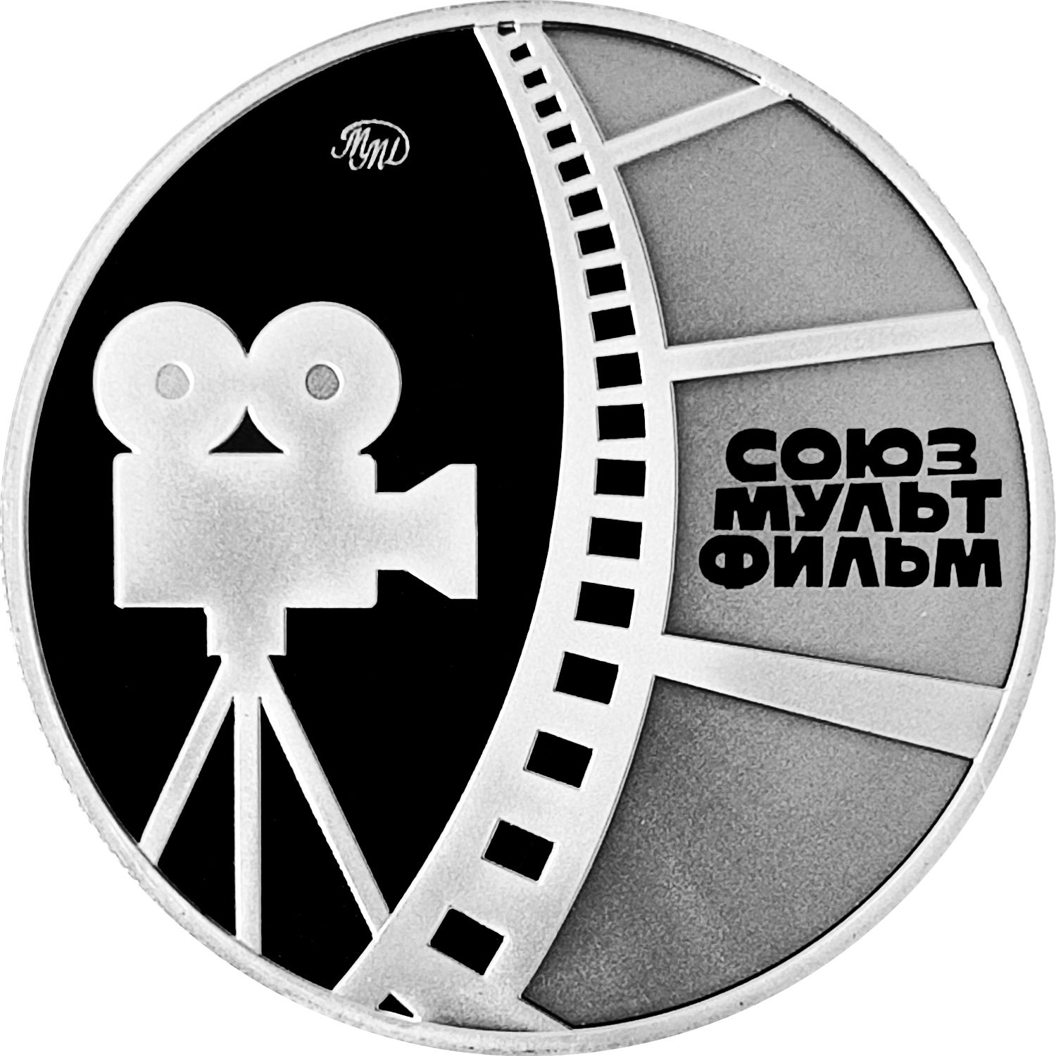 Описание: Стилизованная кинокамера на штативе. Изогнутая пленка с перфорацией и надписью в сегменте, имитирующем кинокадр.