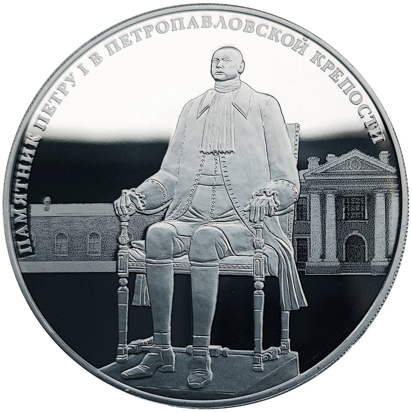 Описание: Рельєфне зображення пам'ятника Петру I в Петропавлівській фортеці, відкрите в 1991 році скульптором Михайлом Шемякіним. Обличчя засноване на автентичній восковій масці обличчя Петра та «Восковій людині», створеній Б. Растреллі та зберігається в Ермітажі. Скульптор навмисно збільшив пропорції тіла імператора в 1,5 рази, що надає зображенню гротескного вигляду. На задньому плані — будівля караульної Обер-офіцера, виконана методом лазерного матування.