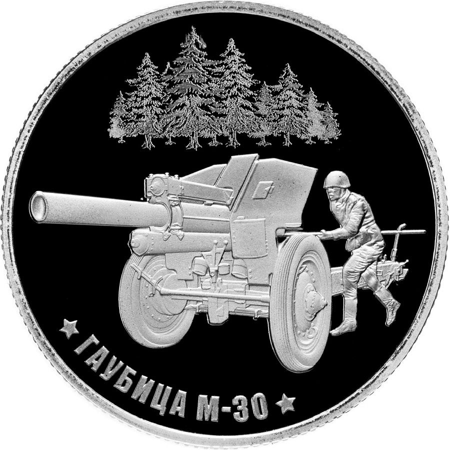Описание: Рельєфне зображення 122-мм гаубиці М-30, яка широко використовується для артилерійської підтримки. Дерева на задньому плані створені за допомогою технології лазерного матування. На краю медалі розміщено напис.