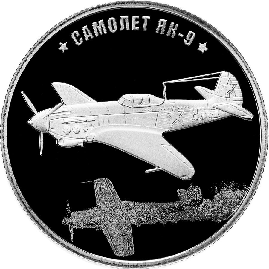 Описание: Рельєфне зображення винищувача Як-9, одного з найпоширеніших винищувачів у Радянському Союзі, відзначалося чудовою маневреністю. Зображення знищеного ворожої літака було створено за допомогою технології лазерного матування. Напис розташований уздовж краю медалі.