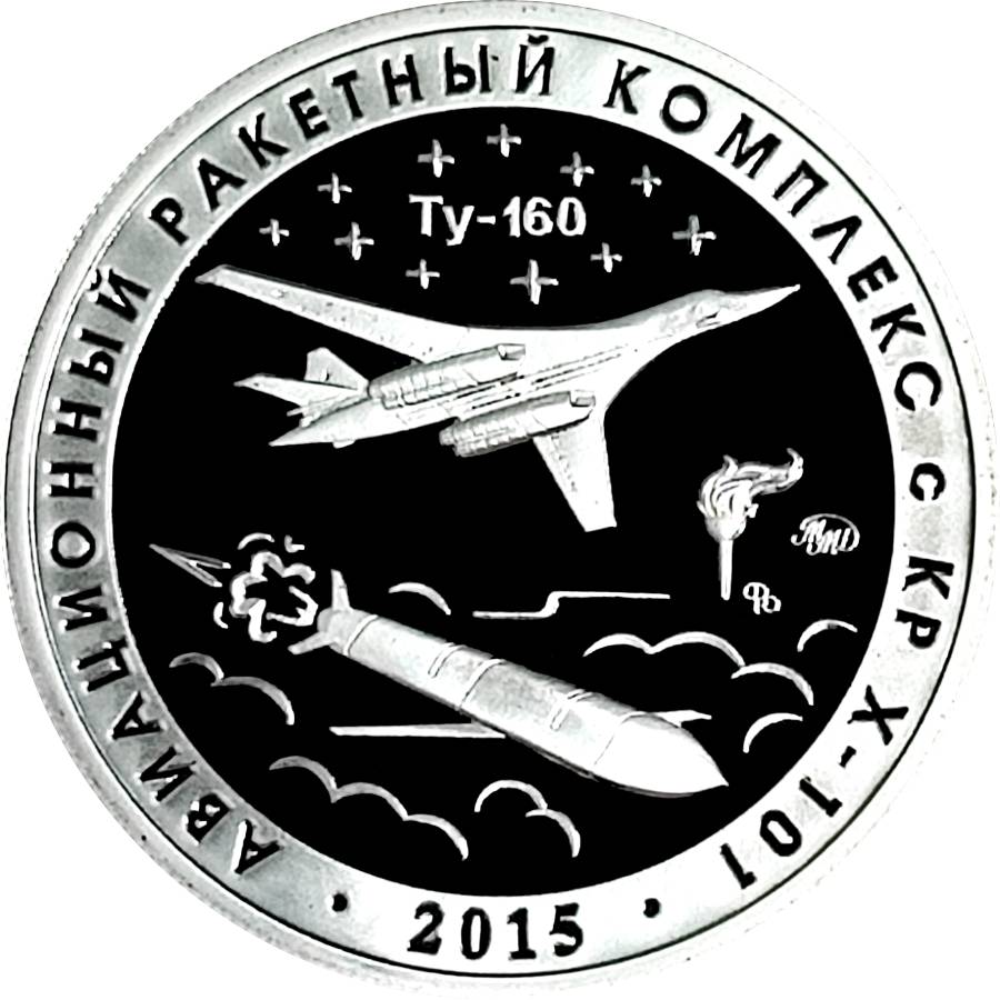 Описание: Надзвуковий стратегічний бомбардувальник і ракетоносій Ту-160 та крилата ракета Х-101. Рік випробувань вказано внизу, з написом навколо кола.