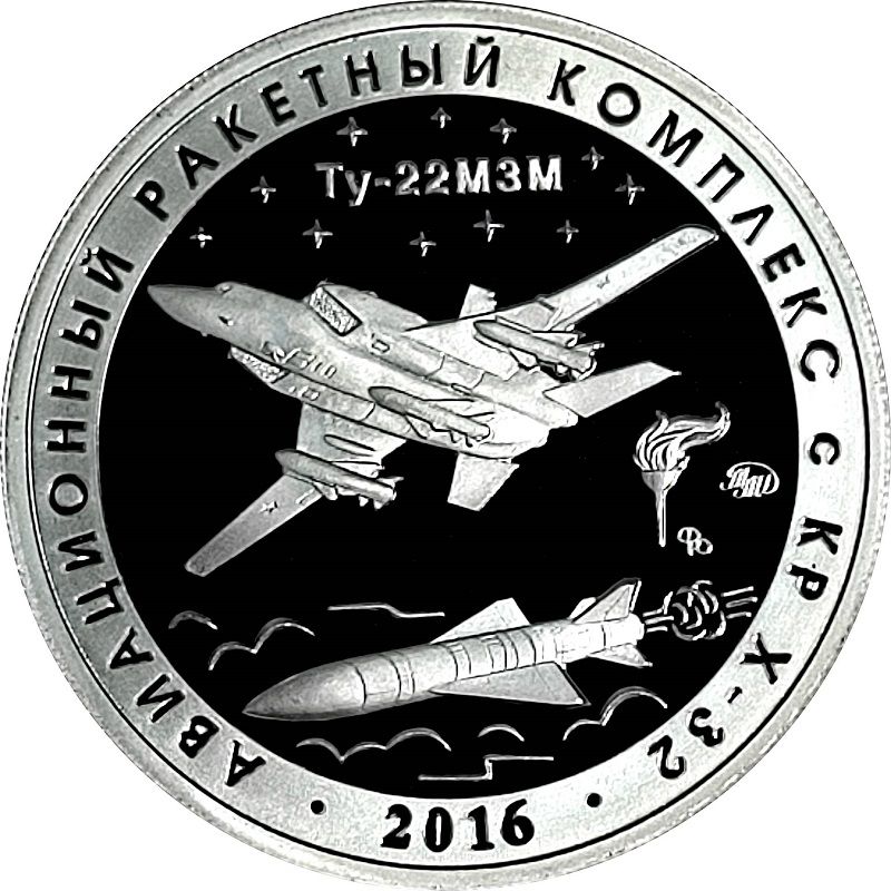 Описание: Надзвуковий бомбардувальник Ту-22 та крилата ракета Х-32. Рік випробування вказано внизу, з написом навколо кола.