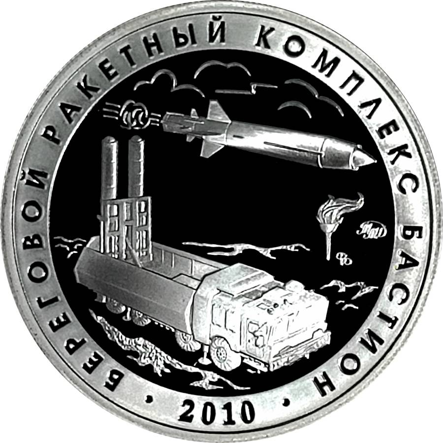 Описание: Берегова ракетна система «Бастіон». Рік випробування вказано внизу, з написом навколо кола.