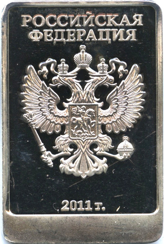 Описание: Державний герб Російської Федерації: двоголовий орел з розпростертими крилами, увінчаний двома маленькими коронами, а над ними — великою, з'єднаною смугою.