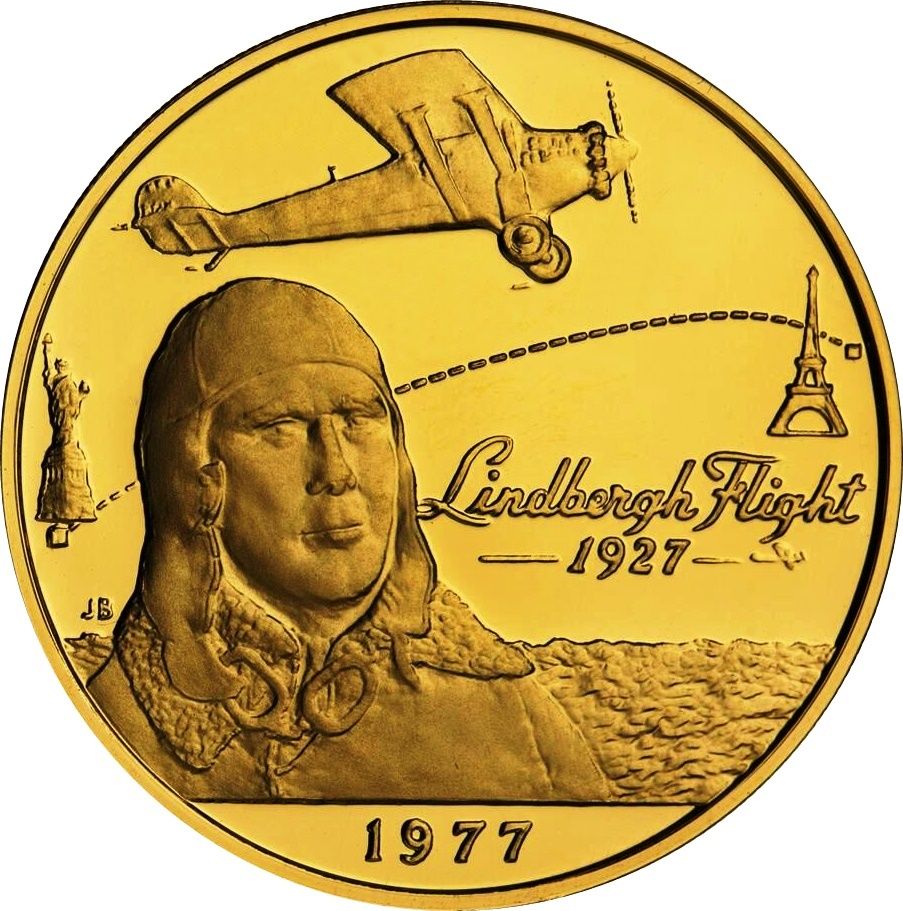Описание: Бюст Чарльза Линдберга 1/4, обращенный вправо, его самолет «Дух Сент-Луиса» вверху, Статуя Свободы слева, Эйфелева башня справа, дата внизу.