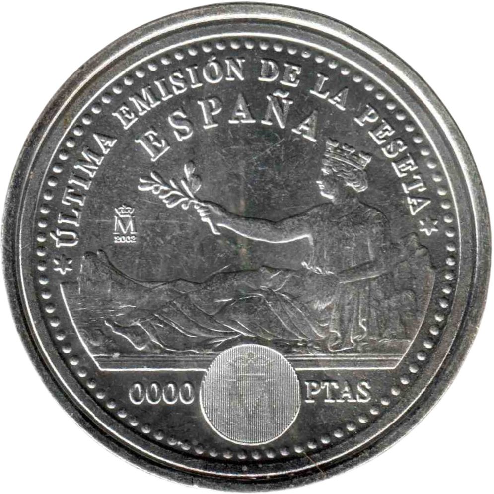 Описание: Лежача коронована Іспанія, що спирається на Піренеї, з Гібралтаром біля її ніг і оливковою гілкою в правій руці. Кругле приховане зображення (знак монетного двору Мадрида та «01»).