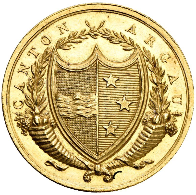 Описание: Герб кантона Ааргау на остроконечном щите. Два рога изобилия, окруженные лавровыми ветвями.