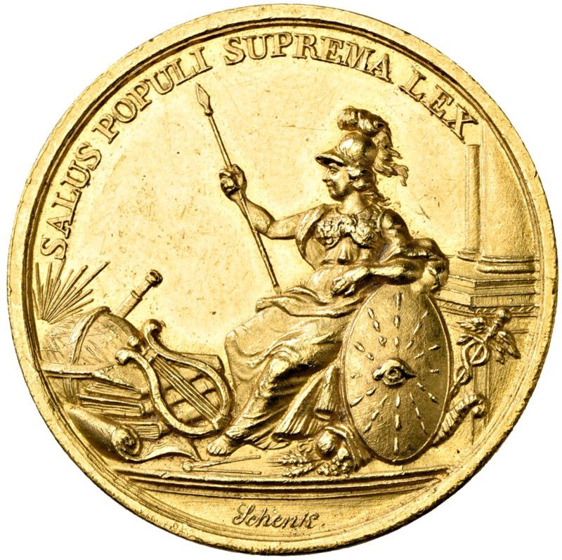 Описание: Минерва, сидящая, обращенная влево, в шлеме, держащая копье в правой руке и опирающаяся левой рукой на овальный щит с глазом в центре. Кадуцей и рог изобилия внизу. Две колонны позади. Глобус, лира, книги, свитки и подзорная труба слева.