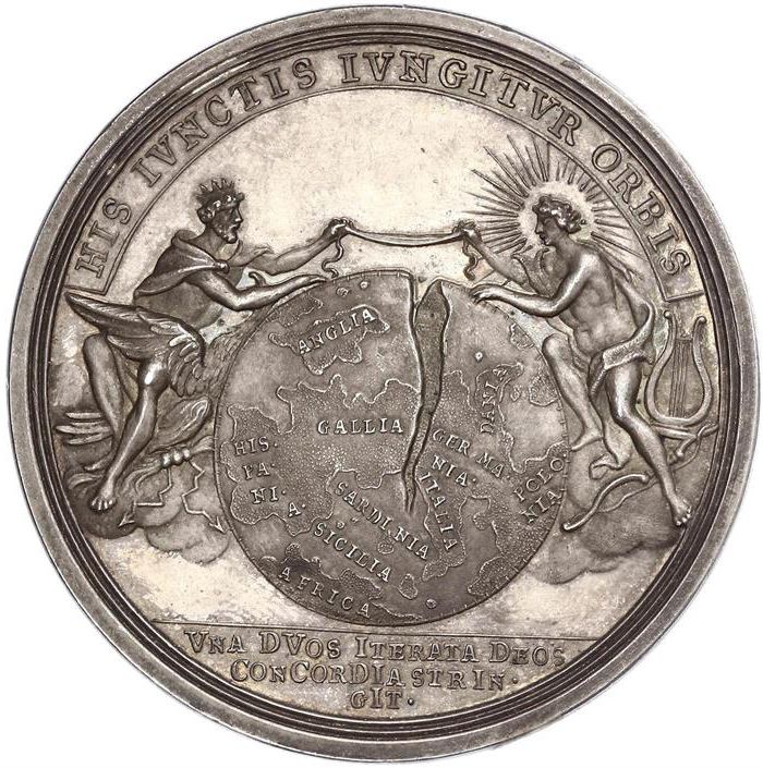 Описание: Глобус с аннотированной картой Европы и Северной Африки, с трещиной между Францией и Германией. Слева — Юпитер, обращенный вправо, увенчанный короной, сидящий на облаке, с орлом и молнией у ног, держащий ленту левой рукой. Справа — Аполлон, держащий другой конец ленты, сияющий, сидящий на облаке, с лирой и луком у ног.