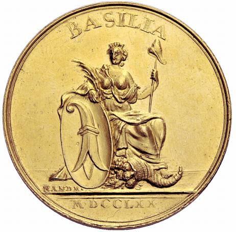 Описание: Герб города Базеля, поддерживаемый богиней города, увенчанной муральной короной, держащей пальмовую ветвь в правой руке и копье с фригийским колпаком в левой руке. Внизу изображен рог изобилия.