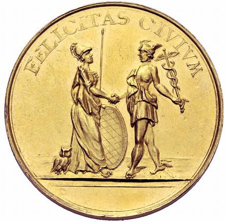 Описание: Боги Минерва и Меркурий пожимают друг другу руки. Минерва обращена вправо, с шлемом, копьем, щитом и совой у ног. Меркурий обращен влево, с кадуцеем, талариями (крылатыми сандалиями) и петасосом (крылатой шляпой).