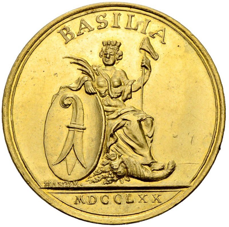 Описание: Герб города Базеля, поддерживаемый богиней города, увенчанной муральной короной, держащей пальмовую ветвь в правой руке и копье с фригийским колпаком в левой руке. Внизу изображен рог изобилия.