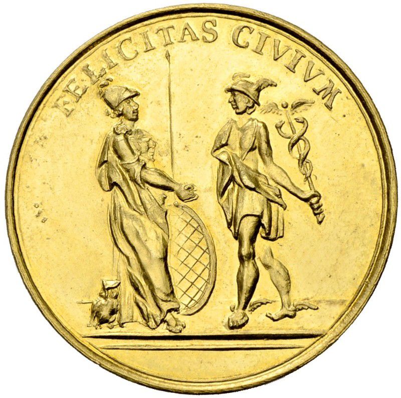 Описание: Боги Минерва и Меркурий пожимают друг другу руки. Минерва обращена вправо, с шлемом, копьем, щитом и совой у ног. Меркурий обращен влево, с кадуцеем, талариями (крылатыми сандалиями) и петасосом (крылатой шляпой).