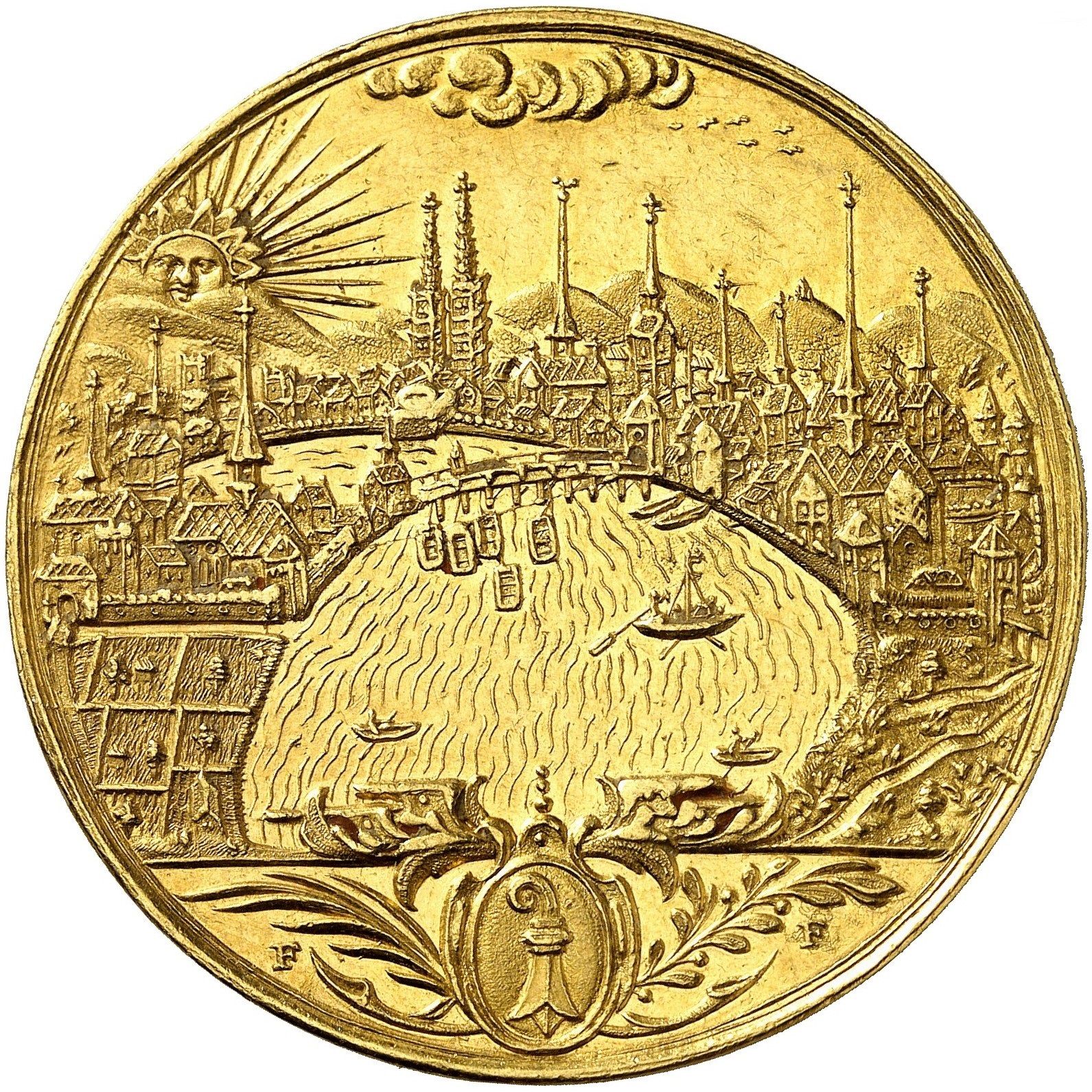 Описание: Вид с высоты птичьего полета на город Базель с рекой Рейн в центре. Антропоморфное солнце, восходящее за холмами на заднем плане. Облака вверху. Герб города Базеля на овальном картуше внизу. Лист пальмы слева. Лавровая ветвь справа.