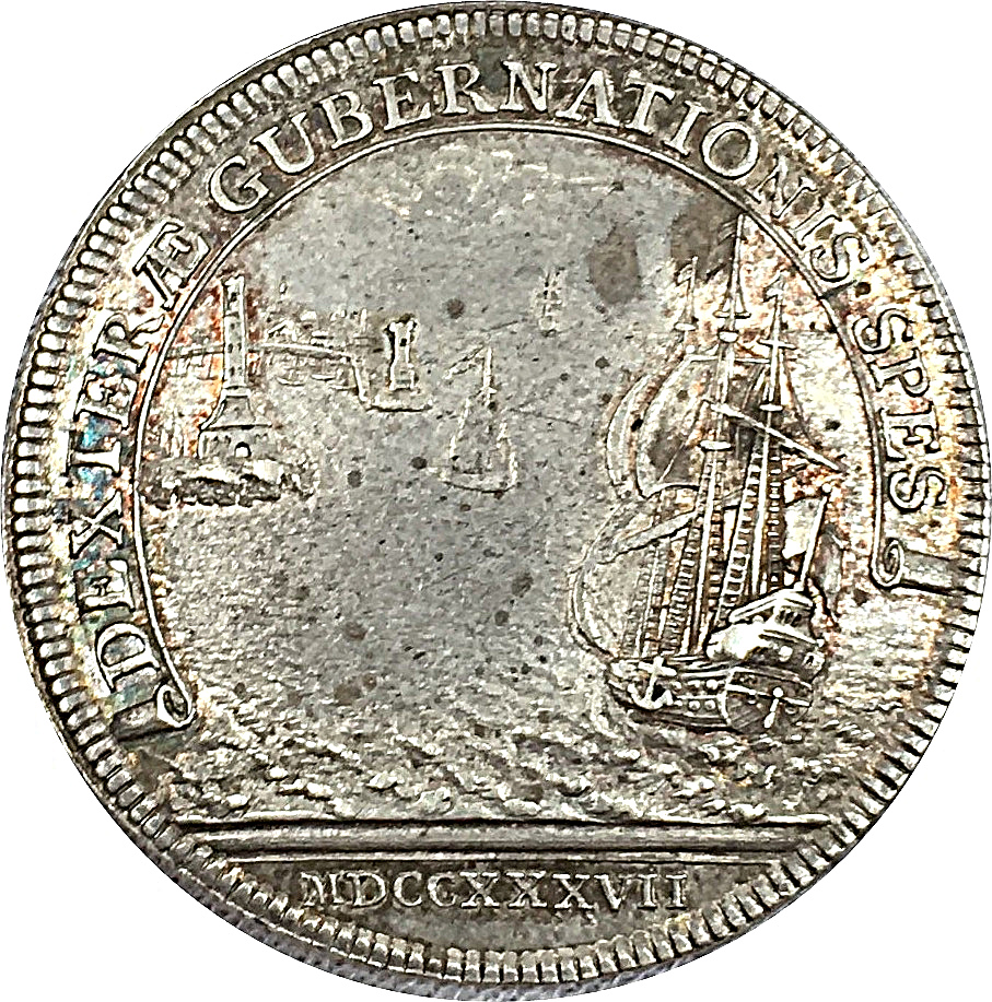 Описание: Обезьяна, держащая зеркало и сидящая на омаре, в стилизованной рамке. На заднем плане глобус, стоящий на пьедестале с различными знаками зодиака. Легенда по бокам и надпись внизу с датой в экзерге.