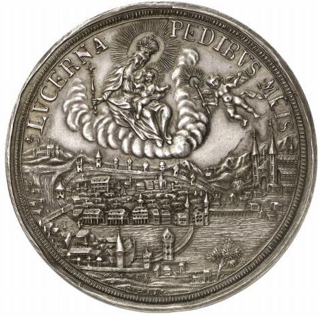 Описание: Вид на город Люцерн с юга с рекой Ройс, озером Фирвальдштеттер, Часовенным мостом, крепостной стеной Музегг и церковью Святого Леодегара. Над городом в облаках изображена Мадонна с младенцем Христом. Справа — путто, обращенный влево, держащий факел в правой руке.