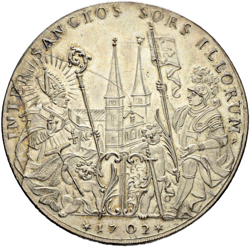 Описание: Герб Люцерна на богато украшенном готическом щите с арабеской в правом поле. Святой Леодегар слева, в митре и епископских регалиях, держит посох в левой руке и благословляет правой рукой. Путто у его ног держит сверло в правой руке и пальмовую ветвь в левой руке. Справа — святой Морис в доспехах, в шлеме с перьями, держащий в правой руке копье с флагом. У его ног — путто, держащий в правой руке меч, а в левой — пальмовую ветвь. На заднем плане — коллегиальная церковь святого Леодегара.
