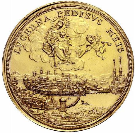 Описание: Вид на город Люцерн с юга с рекой Ройс, озером Фирвальдштеттер, Часовенным мостом, стеной Музегг и церковью Святого Леодегара. Над городом в облаках изображена Мадонна с младенцем Христом. Справа — путто, обращенный влево, держащий факел в правой руке.