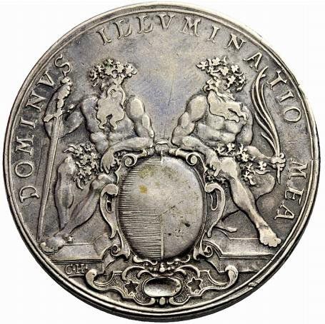 Описание: Герб Люцерна на богато украшенном овальном щите, поддерживаемом двумя дикими людьми в дубовых венках. Человек слева держит меч, а человек справа — пальмовую ветвь.