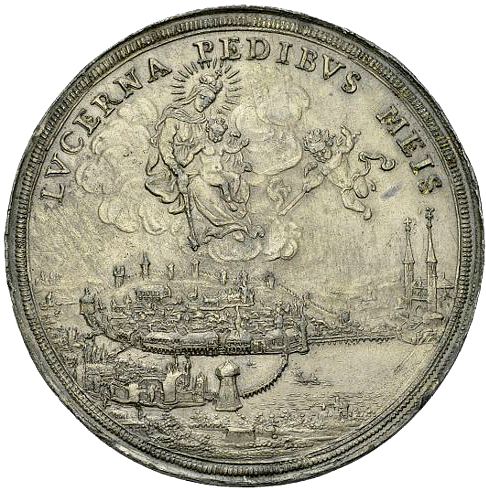 Описание: Вид на город Люцерн с юга с рекой Ройс, озером Фирвальдштеттер, Часовенным мостом, стеной Музегг и церковью Святого Леодегара. Над городом в облаках изображена Мадонна с младенцем Христом. Справа — путто, обращенный влево, держащий факел в правой руке.