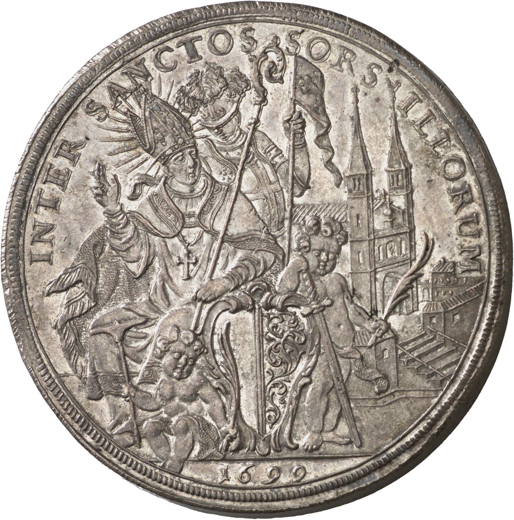 Описание: Святой Леодегар сидит, обращенный влево, смотрит вправо, поднимает правую руку в знак благословения, одет в митру и епископские регалии, в левой руке держит посох. Впереди — герб Люцерна на богато украшенном картуше, поддерживаемом двумя путто. Левый путто сидит, в правой руке держит сверло, а в левой — пальмовую ветвь. Правый путто поддерживает меч правой рукой, а в левой держит пальмовую ветвь. Святой Морис стоит позади, в доспехах и шлеме с перьями, в левой руке держит копье с флагом. На заднем плане — коллегиальная церковь в Люцерне.