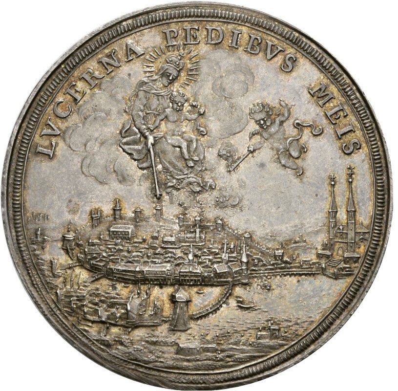 Описание: Вид на город Люцерн с юга с рекой Ройс, озером Фирвальдштеттер, Часовенным мостом, крепостной стеной Музегг и церковью Святого Леодегара. Над городом в облаках изображена Мадонна с младенцем Христом. Справа — путто, обращенный влево, держащий факел в правой руке.