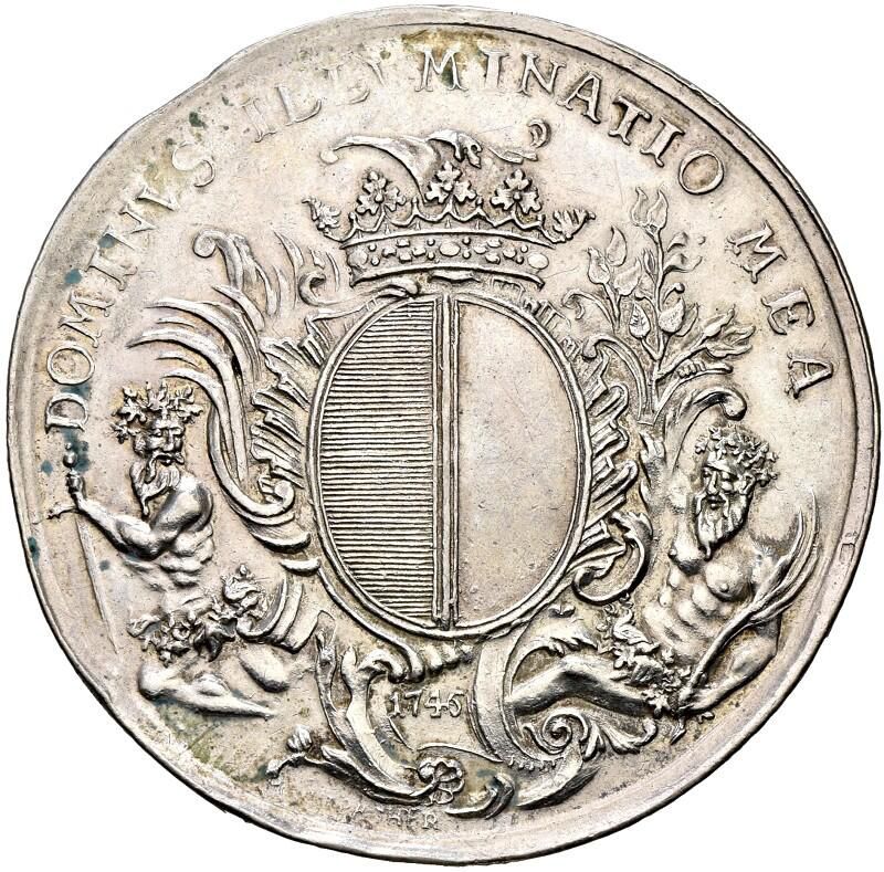 Описание: Герб Люцерна на овальном щите с завитками, поддерживаемый двумя лесными людьми (дикими людьми) внизу, лежащими, с венками на головах и вокруг талии. Левый лесной человек держит меч. Правый лесной человек держит пальмовый лист. Над ними корона.