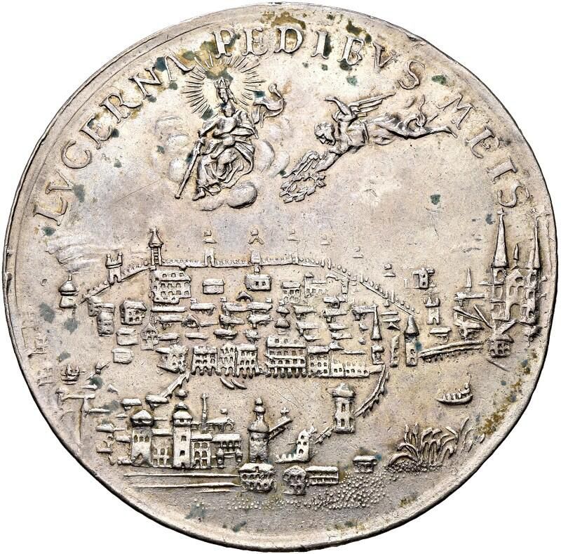 Описание: Вид на город Люцерн с юга с рекой Ройс, озером Фирвальдштеттер, Часовенным мостом, стеной Музегг и церковью Святого Леодегара. Над городом в облаках изображена увенчанная Мадонна с младенцем Христом. Справа — путто, обращенный влево, держащий в правой руке венок.