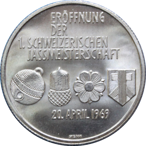 Описание: Немецкая надпись над символами игральных карт Jassmeisterschaft. Конкретная дата внизу.