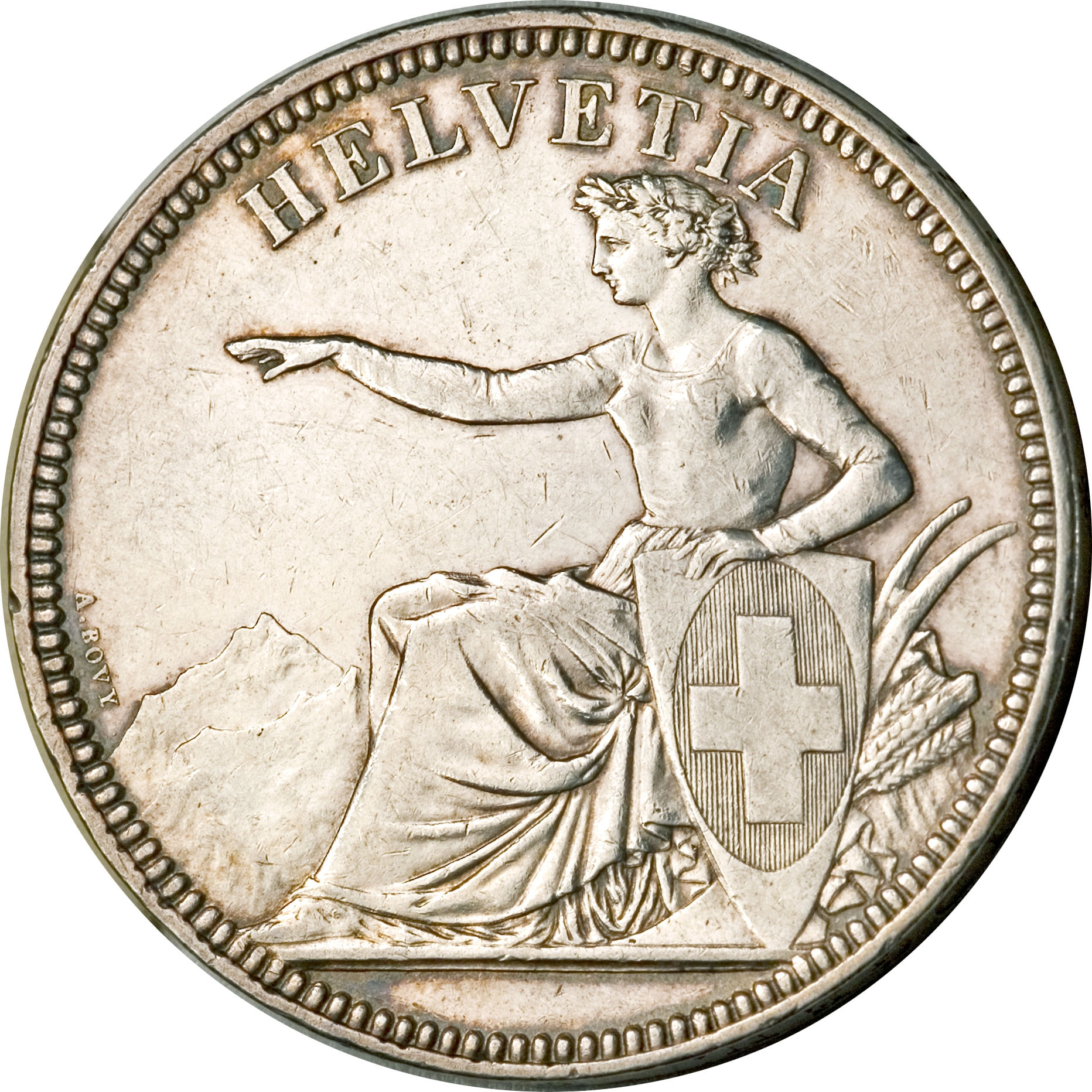 Описание: Сидящая Гельвеция, обращенная влево, в лавровом венке и тоге, с поднятой правой рукой и щитом с гербом Швейцарии в левой руке. Плуг и колосья пшеницы справа. Горы на заднем плане.