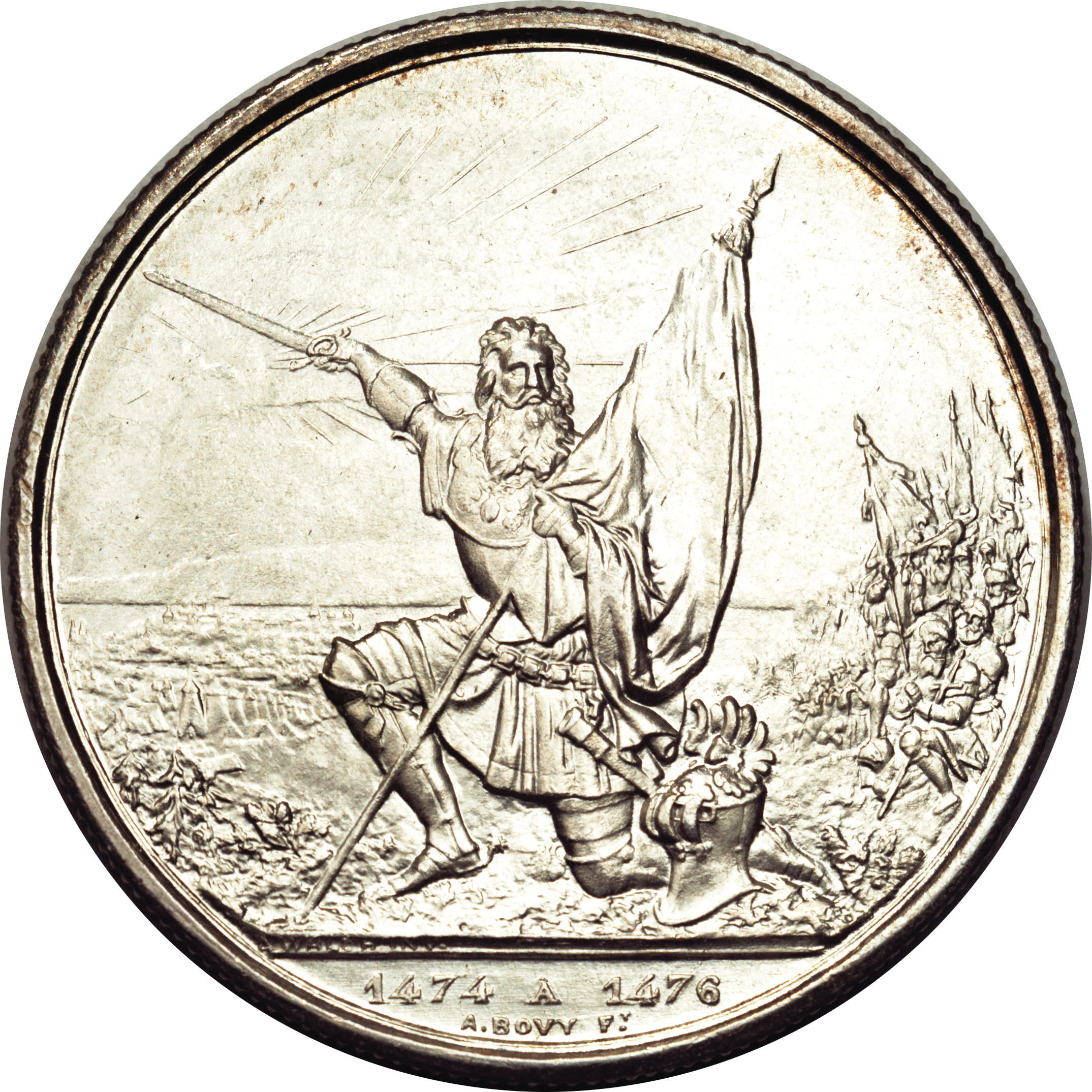 Описание: Под лучами яркого солнца изображен бородатый солдат в доспехах, стоящий на коленях и размахивающий мечом правой рукой, указывая на небо, а в левой руке он держит знамя со швейцарским флагом, шлем лежит у его ног; позади — пейзаж и сопровождающие его солдаты.
