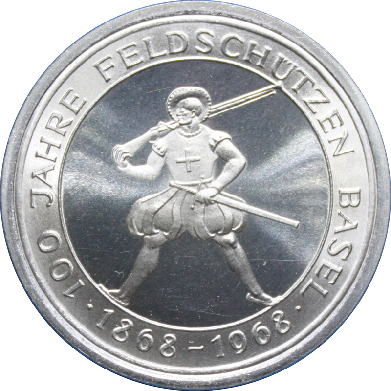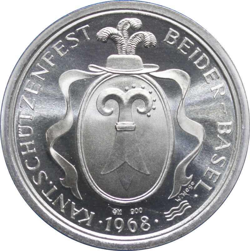 Описание: Надпись (и три параллельные волнистые линии справа от даты) по периметру монеты, окружающая изображение швейцарского картуша, украшенного лентами и шляпой с 3 перьями. Клеймо пробы серебра, дата и имя дизайнера/гравера.