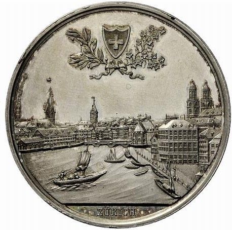 Описание: Вид на город Цюрих. Вверху — герб Швейцарии и венок из лавровых и виноградных ветвей, перевязанный лентой.