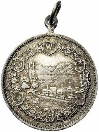 Описание: Вид на Веве в замкнутом виноградном венке, на котором размещены шесть щитов с гербами основных коммун округа Веве.
