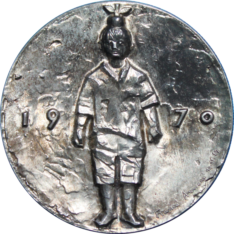 Описание: Ребенок типа Вильгельма Телля с яблоком на голове. Дата расположена по горизонтальной линии по центру. Намеренно грубая текстура поля с глубоким рельефом.