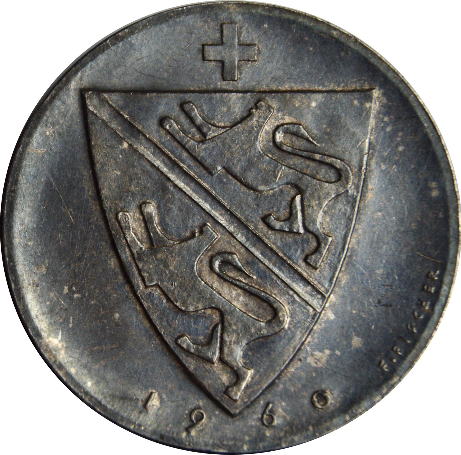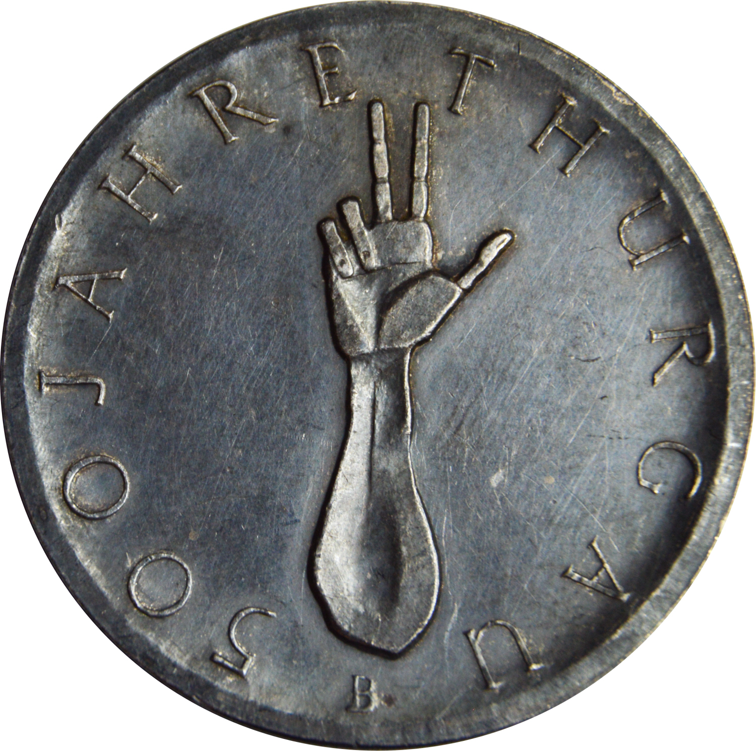 Описание: Герб кантона Тургау с двумя львами, крестом вверху и годом внизу. В положении «4 часа» — имя художника.