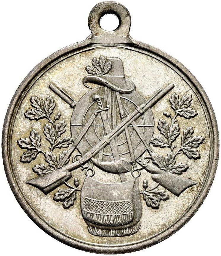 Описание: Мешочек с порохом и фляга, свисающие с мишени; шляпа, украшенная тремя дубовыми листьями. Две винтовки, одна спереди и одна сзади мишени, перекрещивающиеся между собой. Меч в центре, дубовые ветви слева и справа.