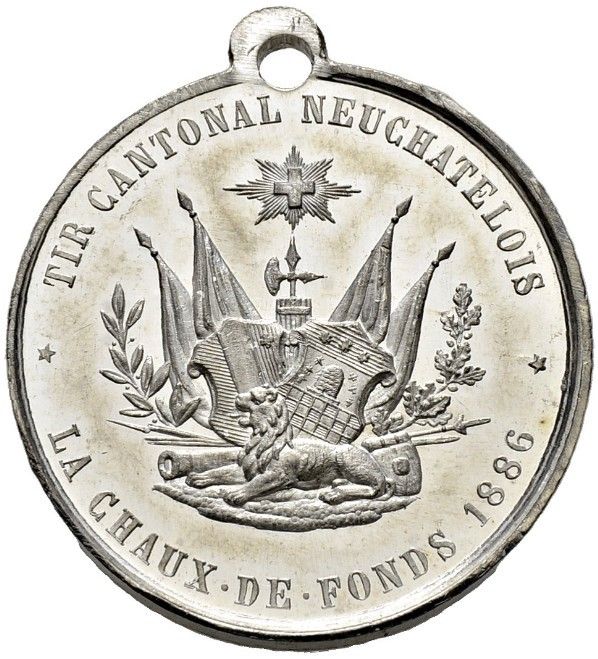 Описание: Лежащий лев у подножия герба кантона Невшатель слева и Ла-Шо-де-Фон справа. Сзади — ликтор и четыре флага. Ветка лавра слева и дуба справа. Над ними — лучевой швейцарский крест.