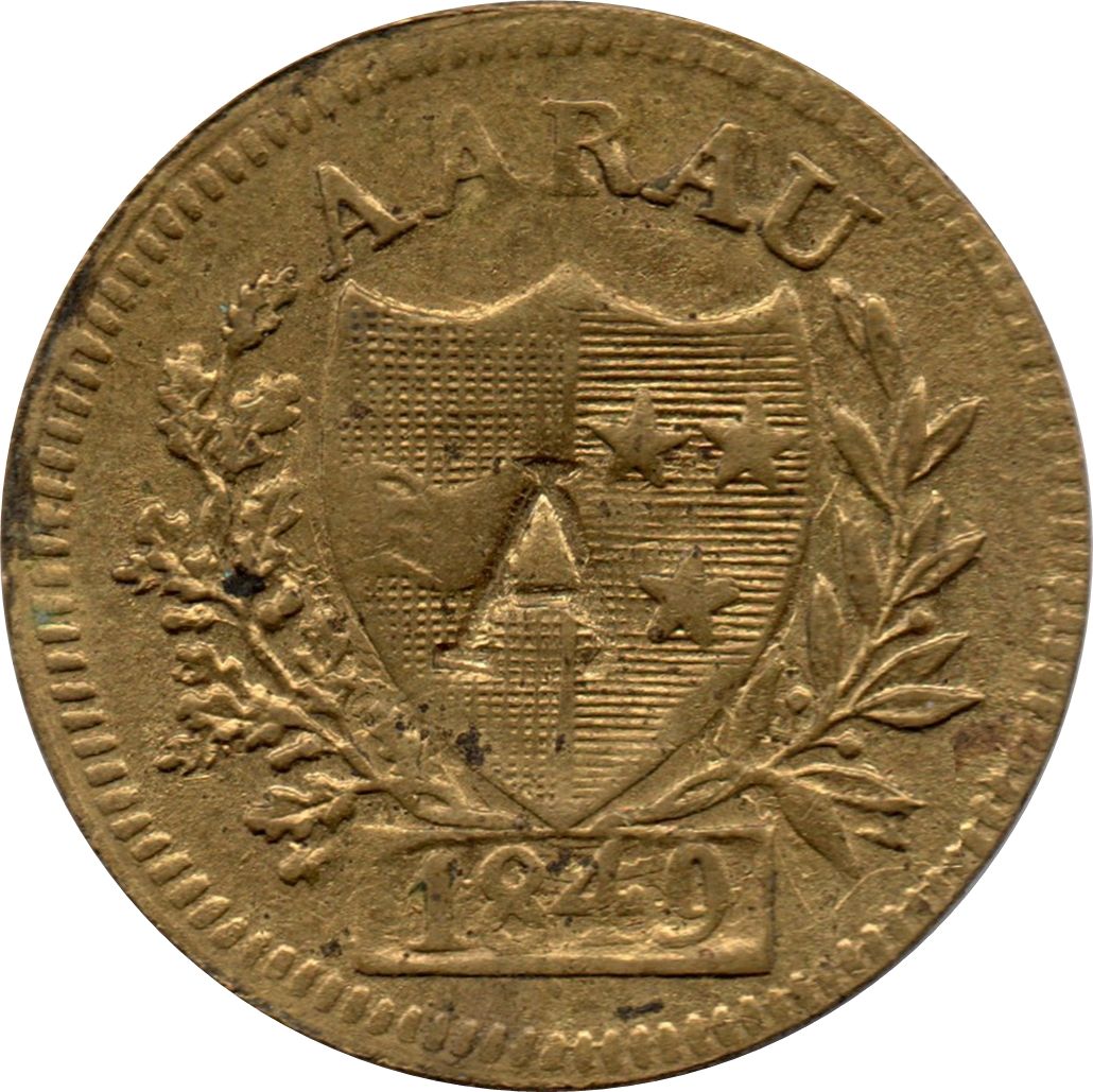 Описание: Герб Аарау в центре. Венок, образованный дубовой ветвью слева и лавровой ветвью справа. Рамка с датой внизу. Контрмарка на щите.