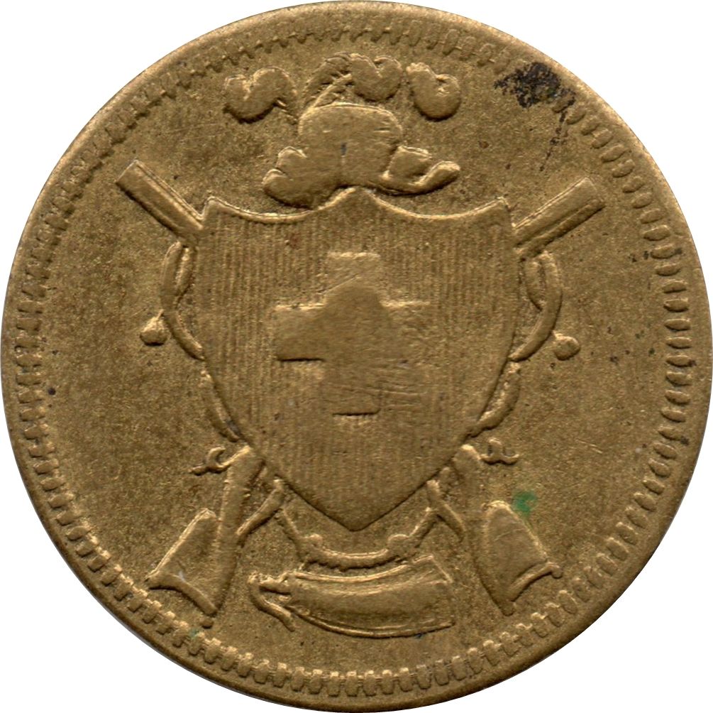 Описание: В центре — герб Швейцарии. Сверху — шляпа с перьями. Внизу — пороховница. Сзади — две скрещенные винтовки.