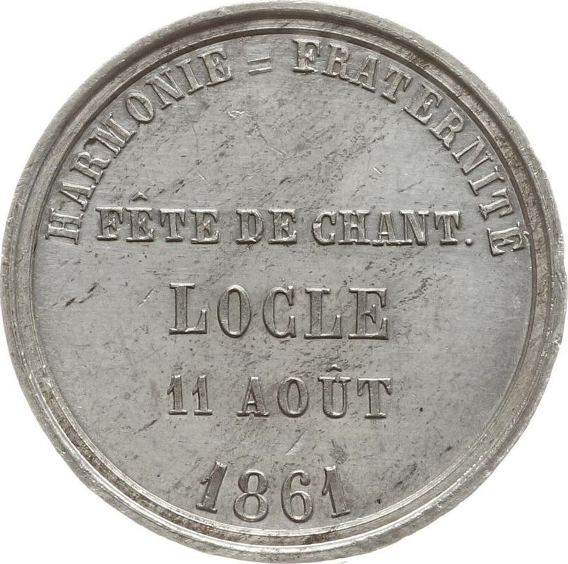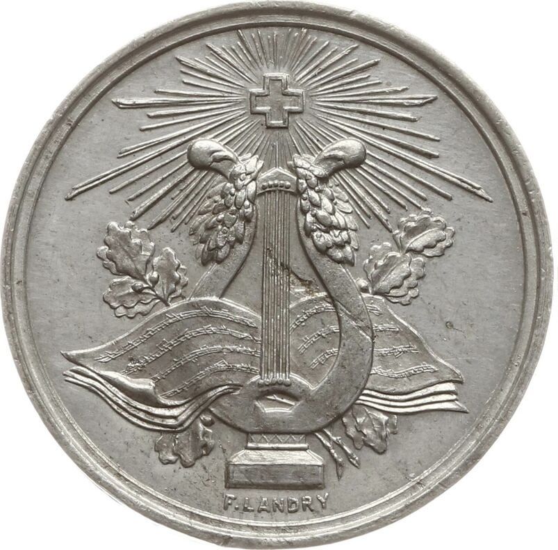 Описание: В центре изображена лира, пересеченная перегородкой. С каждой стороны перегородки свисают два лавровых венка, по обеим сторонам — по две дубовые ветви. Над ними — лучезарный швейцарский крест.