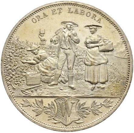 Описание: Сцена сбора урожая. Внизу на двух лавровых ветвях изображен герб Веве. На заднем плане — горы и озеро.