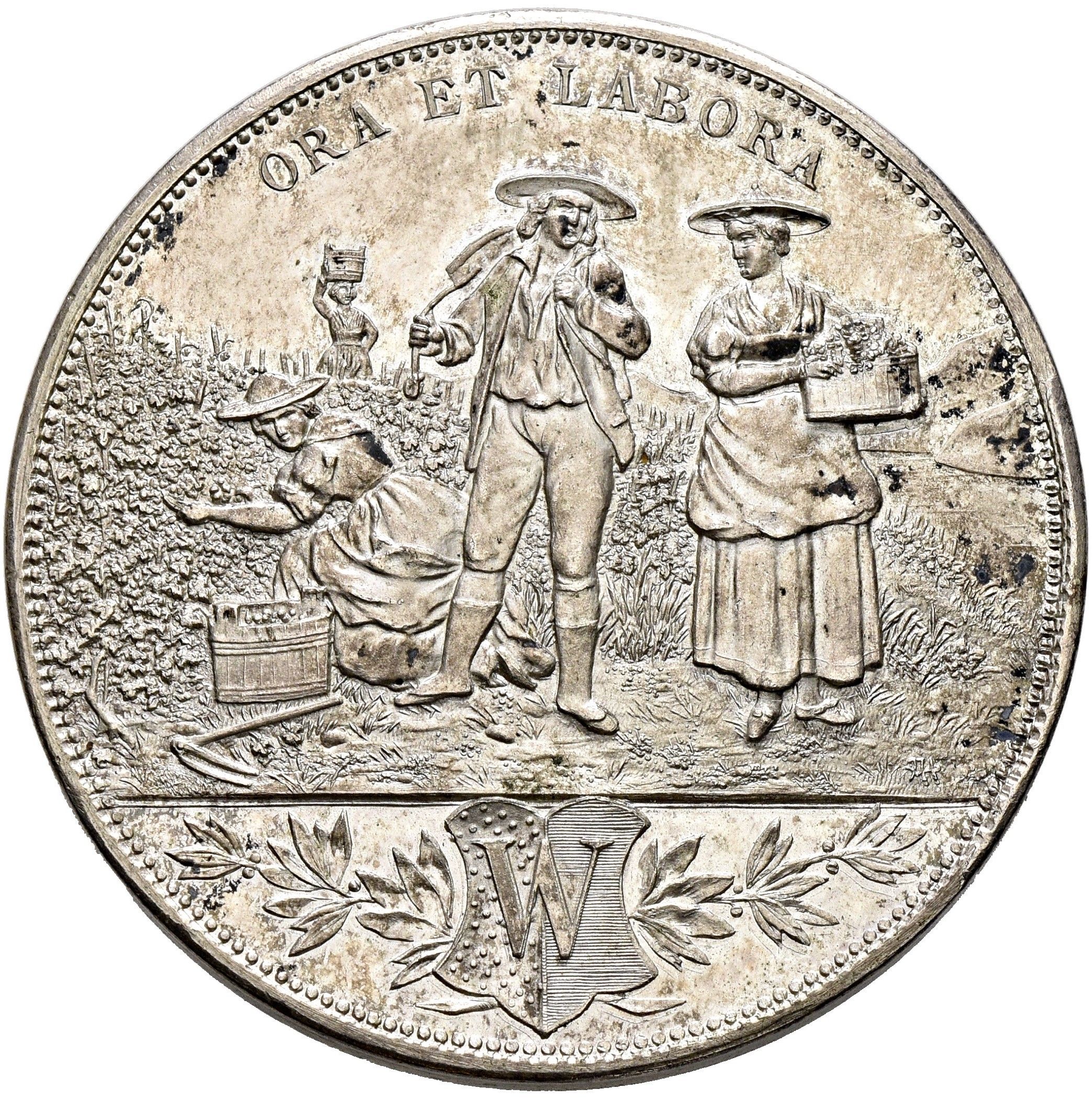 Описание: Сцена сбора урожая. Внизу на двух лавровых ветвях изображен герб Веве. На заднем плане — горы и озеро.