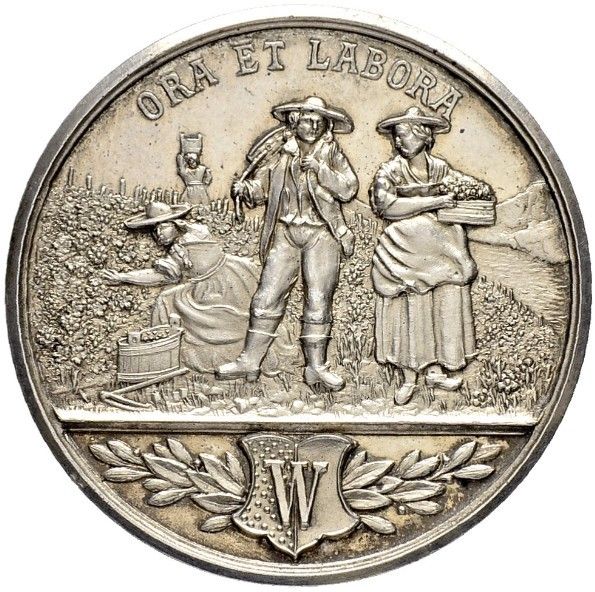 Описание: Сцена сбора урожая. Внизу на двух лавровых ветвях изображен герб Веве. На заднем плане — горы и озеро.