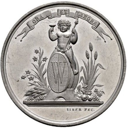 Описание: Херувим с виноградными лозами вместо волос, сидящий на бочке с гербом Веве, держащий чашу и скипетр, в окружении цветов, злаков и фруктов.