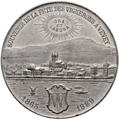 Описание: Вид на город Веве с Женевского озера. Герб Веве внизу. Лучезарное солнце с надписями внутри вверху.