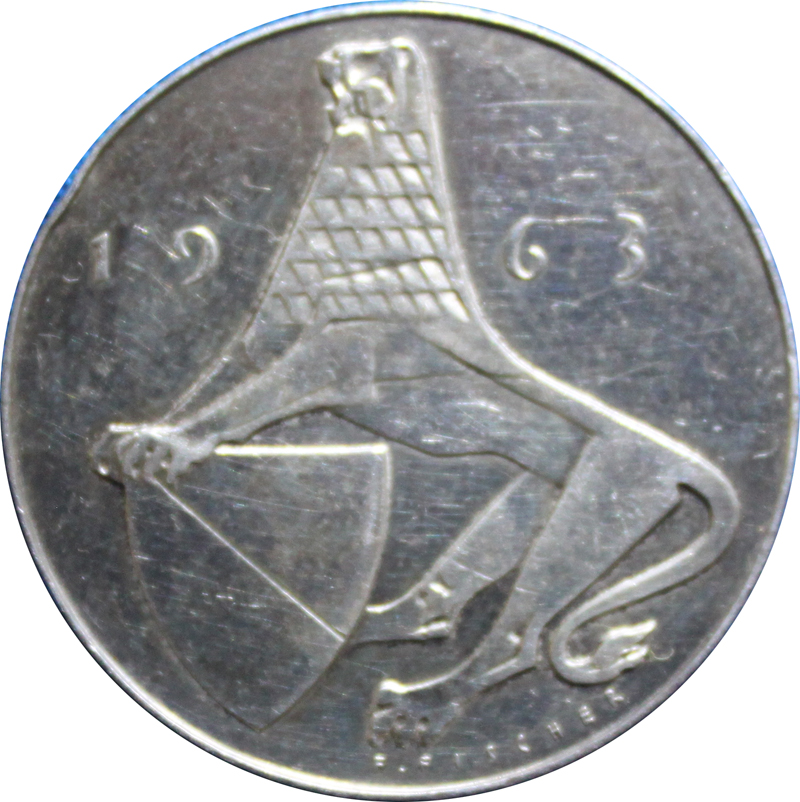 Описание: Надпись по периметру монеты, окружающая изображение винтовки, направленной вертикально. Клеймо, указывающее на пробу серебра.