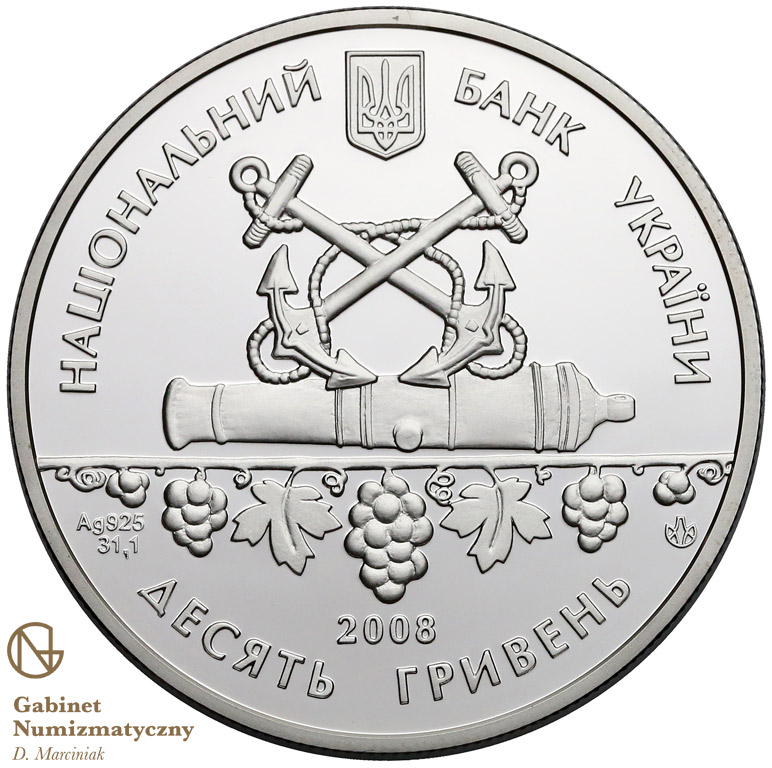 Описание: На монеті зображено схрещені якорі та корабель-символ міста як морського порту та фортеці, під гарматою — стилізовані грона винограду; зверху — малий герб України та напівкруглий напис: НАЦІОНАЛЬНИЙ БАНК УКРАЇНИ (Національний банк України, нижче — ДЕСЯТЬ ГРИВЕНЬ/ 2008 (Десять гривень/2008), позначення металу Ag 925 і 31,1, його вага в пробі; на обох монетах є логотип Монетного двору НБУ.