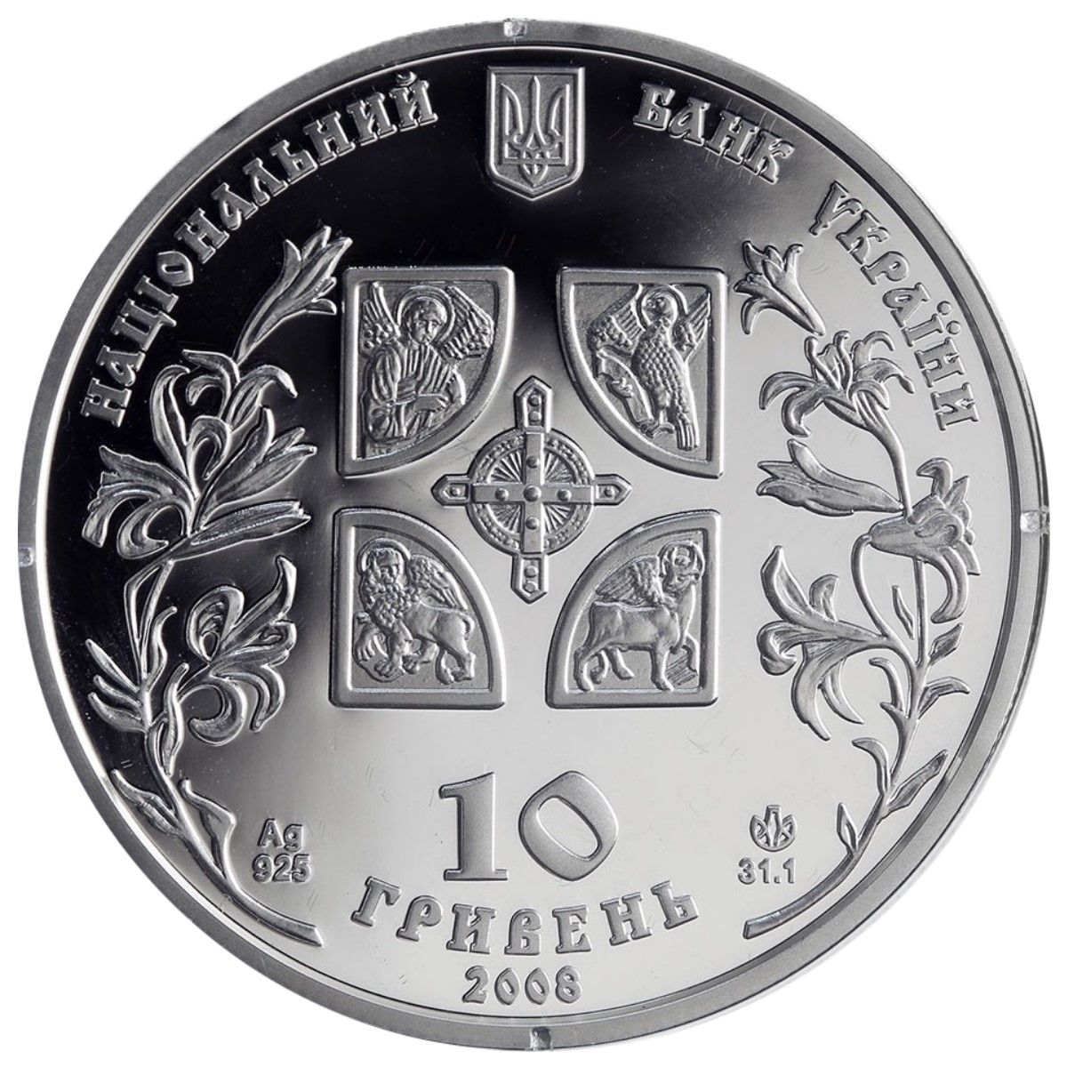 Описание: На монеті зображено невеликий герб України та напівкруглий напис – НАЦІОНАЛЬНИЙ БАНК УКРАЇНИ (Національний банк України), у центрі – стилізоване зображення Євангелія, по обидва боки якого розташовані лілії, що асоціюються з Дівою Марією.